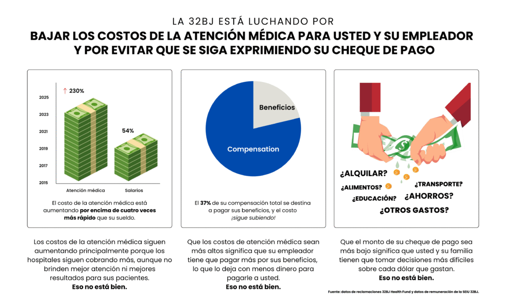 Su empleador contribuye al costo de sus beneficios de salud según lo establecido en el contrato acordado con el sindicato mediante el proceso de negociación colectiva. Los empleadores deben tomar decisiones difíciles sobre cómo gastar su dinero para gestionar sus negocios. Si su empleador debe seguir pagando más por sus beneficios debido al aumento de los costos de atención médica, tendrá menos dinero para pagarle cada semana, y eso no está bien.